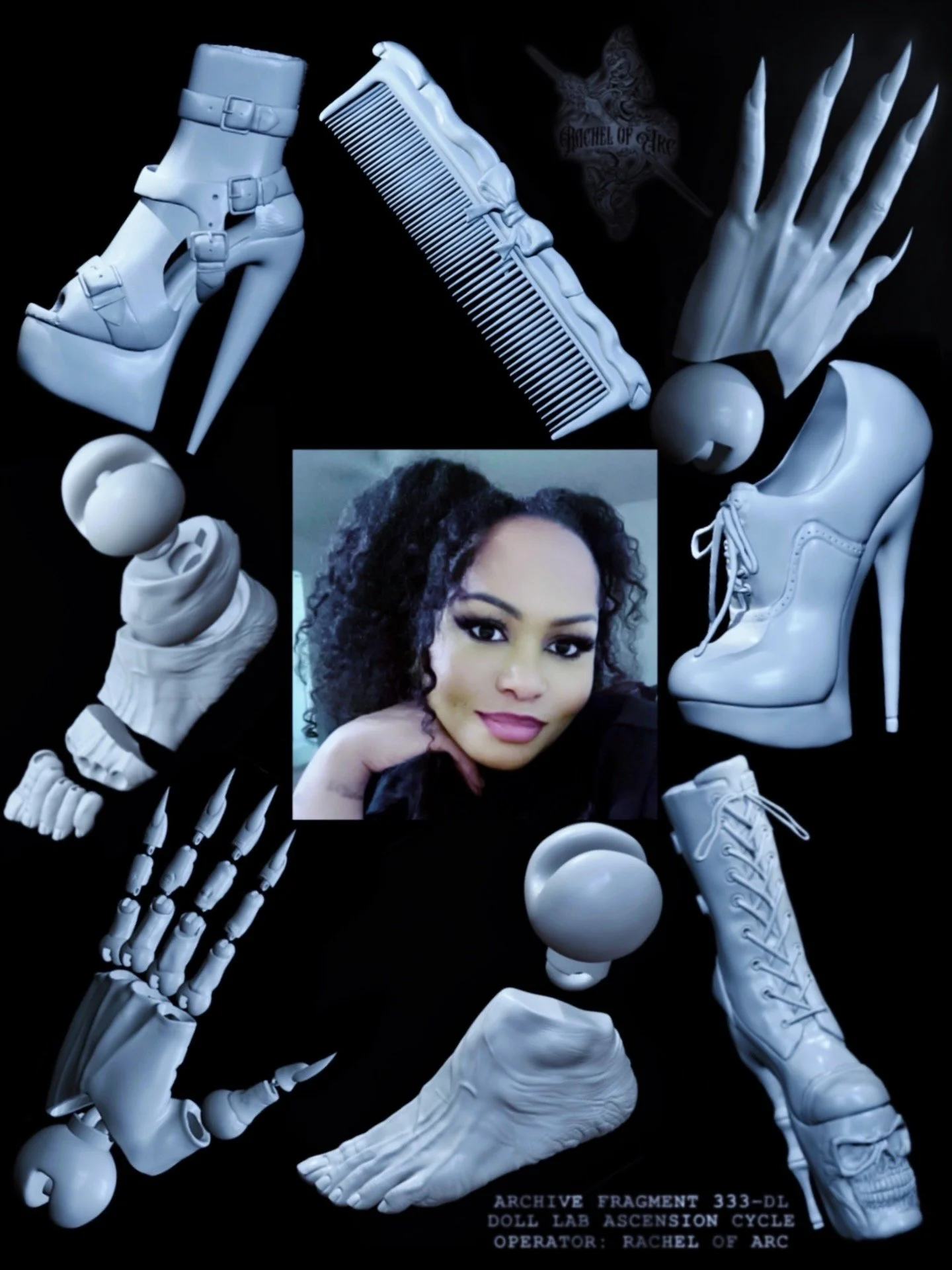 Central operator image surrounded by thirty days of anatomical outputs, joint prototypes, skeletal studies, and surface tests arranged against a black field, functioning as a consolidated record of incremental Lab evolutions.